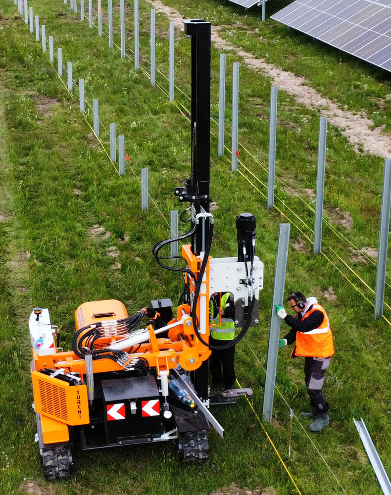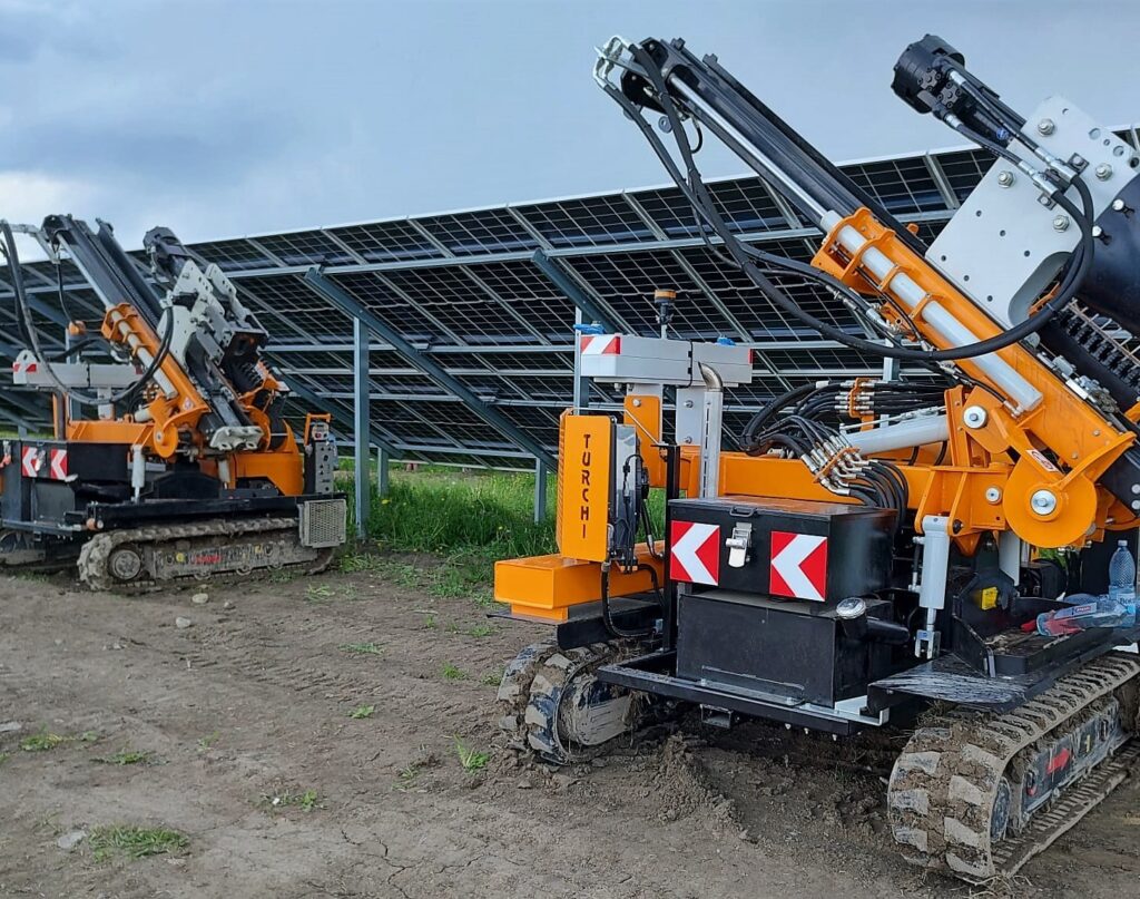 Lucram cu vibrosonete marca Turchi 300 F, fabricatie 2021 si 2023, cu puterea de batere a ciocanului hidraulic de 930 Jouli, care poate introduce stalpi cu lungimea de pana in 6 metri.